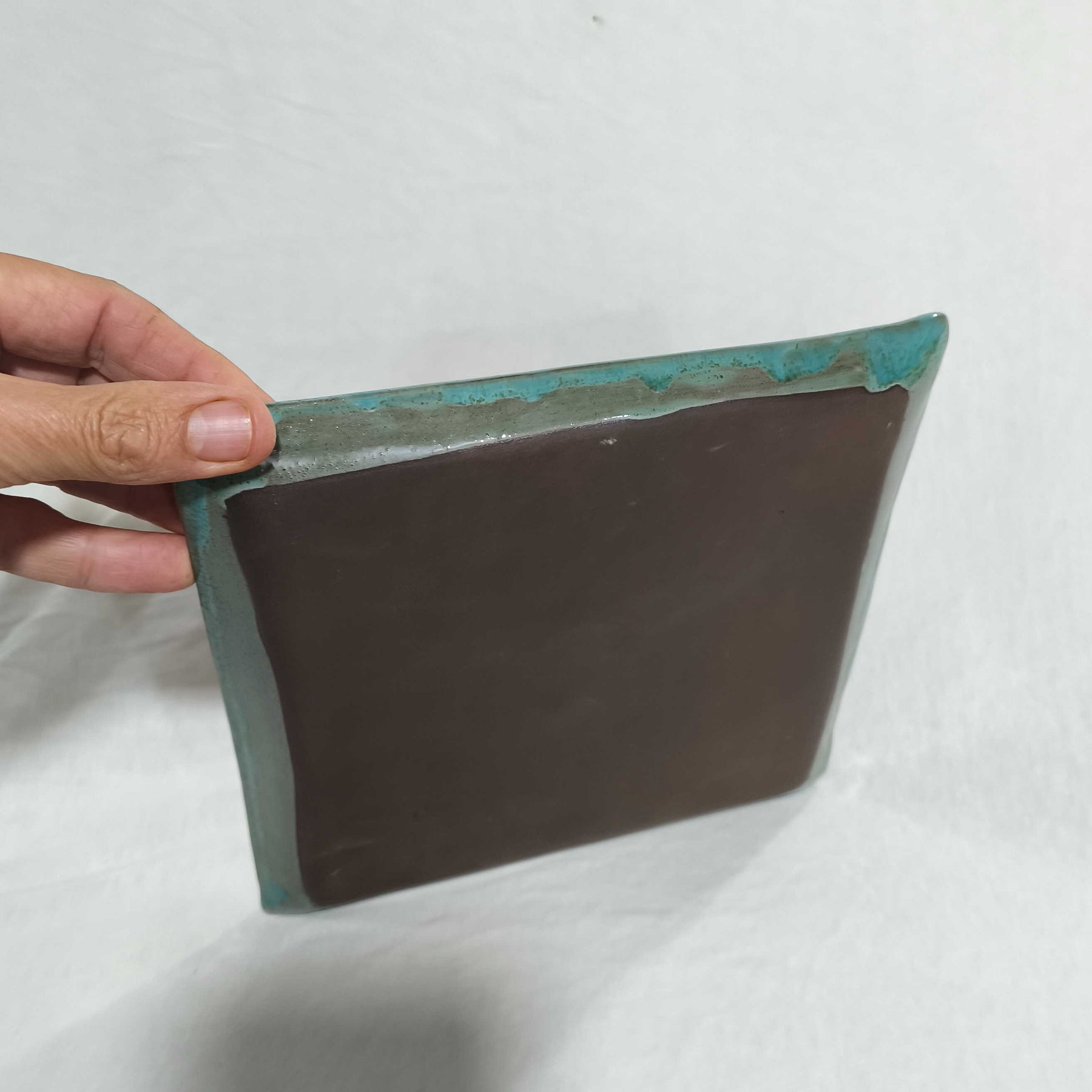 פריט שנעשה ידנית, בצורה מרובעת, עם עיטורי עלים עדינים בשוליים.